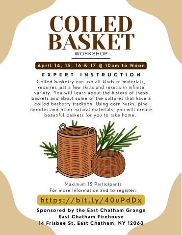 Coiled basketry can use all kinds of materials, requires just a few skills and results in infinite variety. We will learn about the history of these baskets and about some of the cultures that have a coiled basketry tradition. We will use corn husks, pine needles and other natural materials to create beautiful baskets for you to take home.